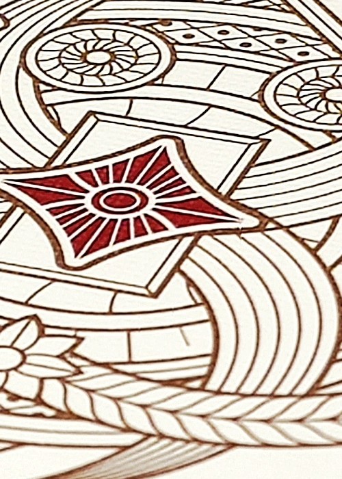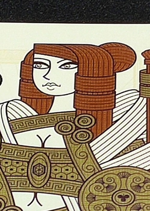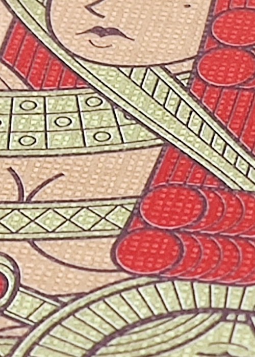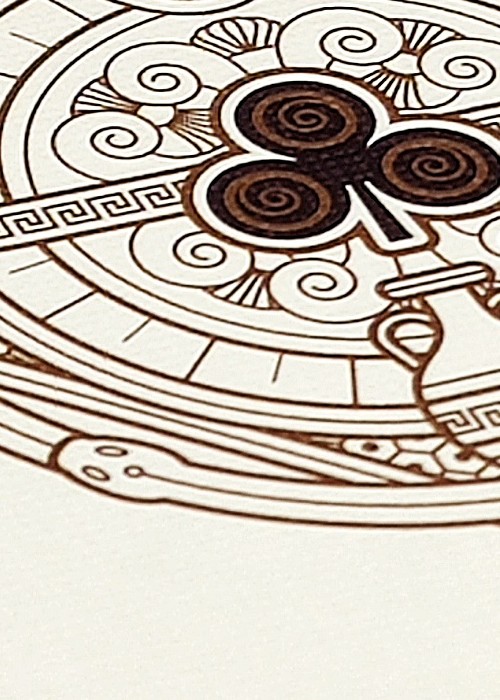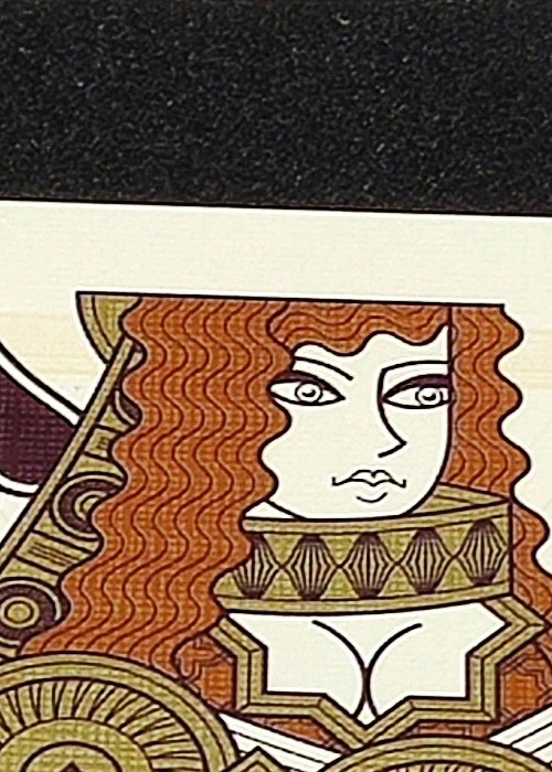 Suits are inspired by ancient civilizations, for example Hearts are inspired by Egyptians. The King is a Pharaoh, and the Jack is a priest of Life. Spades are inspired by Babylonians and Persians. Clubs are inspired by Greeks.The Jack is a Hoplite warrior, and the King is a Philosopher. Pips are elaborate, custom and include metallic inks. All aces are custom, not only the Ace of Spades. There is a winged snake on the AoH. Omnia Antica uses a lot of copper metallic ink, even on the card back Bordered. As always, queens are pretty.
