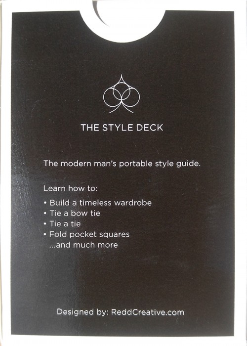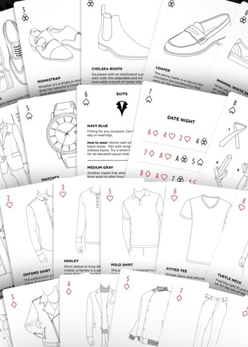 The Style Deck is a visual style guide in a deck of poker-sized playing cards that can be carried anywhere. The Style Deck is to be a usable tool for men to get the most out of their wardrobe. The Style Deck includes visual guides for different types of outerwear, shoes, clothing, and accessories. Visual guide for different types of outerwear, shoes, clothing and accessories • Advice on pairing items in your wardrobe • How-tos (how to tie a tie, bow tie, fold pocket squares) • A deck of poker sized playing cards