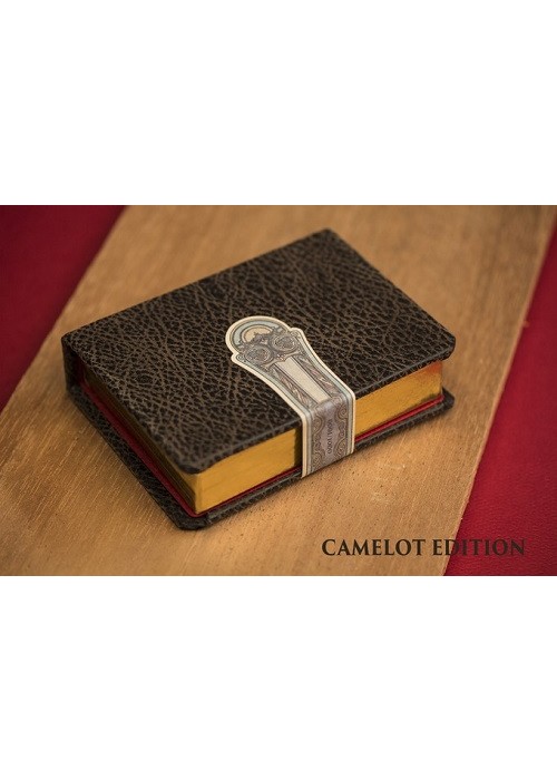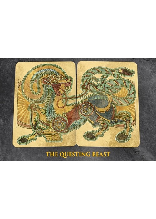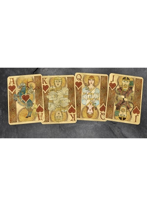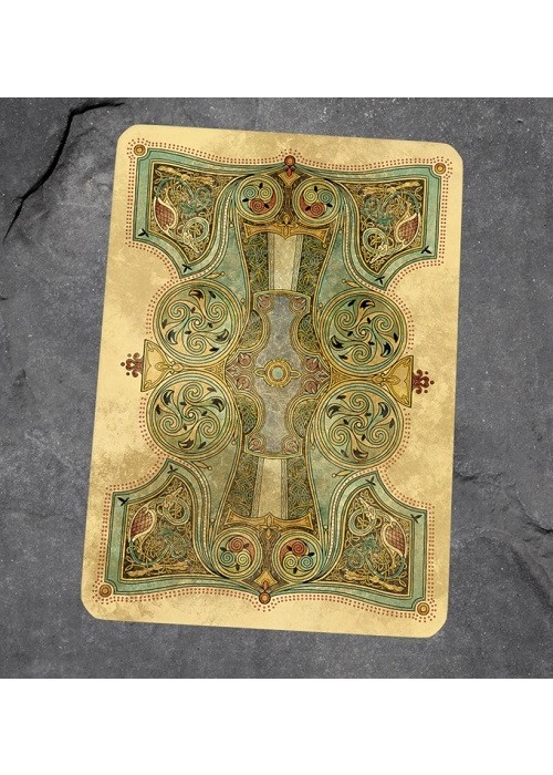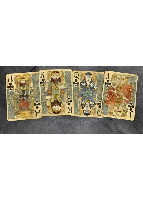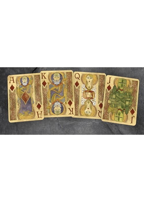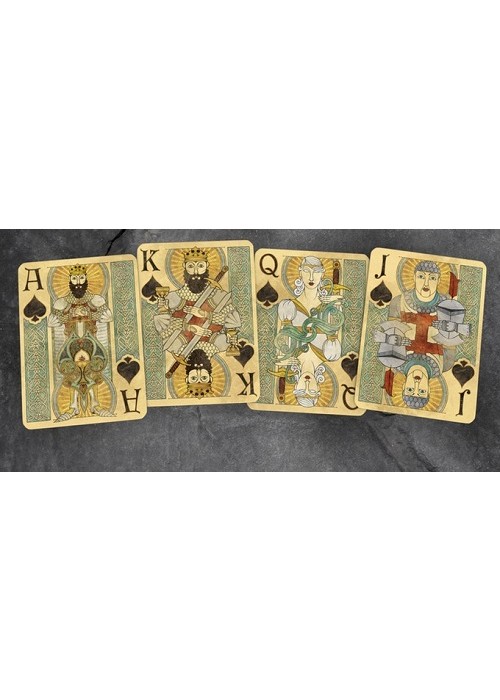 The art for this deck is a reflection of the Book of Kells. The Book of Kells is a beautiful hand drawn and written illuminated manuscript that tells the story of the four Gospels of the Bible. This book was written around the same time as the origins of the King Arthur story. This legend and art style are a perfect compliment to each other. In the Camelot Edition, each suit will have its own unique suite Celtic knot Bordered. Other notable differences will be much more elaborate aces and a unique dyptich joker.