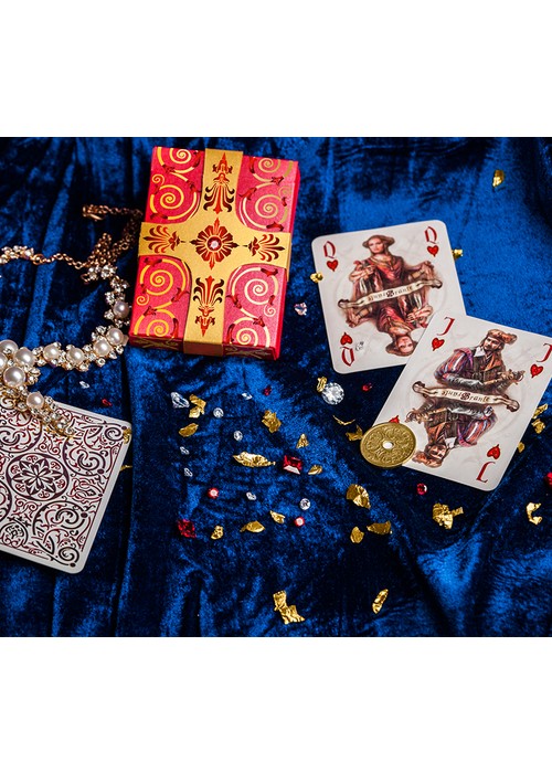 Branle Playing Cards deck portrays history and culture of 16-17 centuries. Each of the suits can be associated with a particular European country. For example, the spades – Britain, hearts – France, clubs – Spain and diamonds – Eastern Europe (Rzeczpospolita, Transylvania, Hungary). Suits are not linked to these countries directly, but the association is undoubtedly present. It is more like an alternative view to the real European history and culture of that era. This Third edition Branle – Tesoro, symbolizes wellness, riches and treasures of European monarch families. Link: http://www.kickstarter.com/projects/891191024/branle-tesoro-playing-cards/