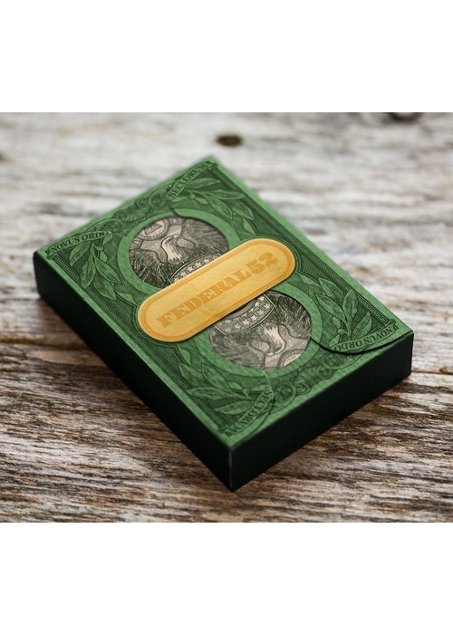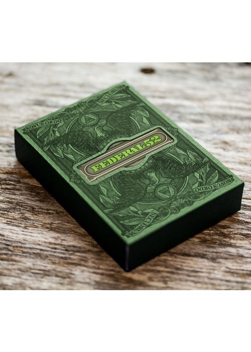 Only 200 will be produced. Cards printed by the United States Playing Card Company. Cards printed on Bee Casino Stock (the same as the original Fed 52 series). Cards will have an embossed air cushioned finish. Inner Tuck case will have full-color printing, embossing, and hot stamped foiling, on premium matte finish stock. Gold Foil Seal. Made in the USA with recycled materials. Outer tuck case will be hand printed by Jackson Robinson on his 1962 Heidelberg Letter-Press. Outer tuck case WAS NOT hand numbered. The Federal 52 2nd Edition is a hybrid of both the original Federal 52 court card set and art work (that was featured in the Federal 52, Gold Certificate, and Silver Certificate decks) and the art work of the Reserve Note decks. In this edition, the artist took his favorite artistic elements of the entire Federal 52 series and created an entirely new and unique deck of playing cards. Outer tuck case was hand printed by the artist on his 1962 Heidelberg Letter-Press.