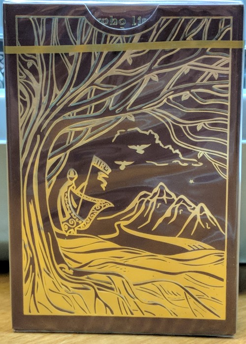 Scans of each card can be seen at www.marytcusack.com/maryc/decks/html/Cards/Midgard.htmlThe Midgard playing card decks were released as a pair of decks, Danegeld (black) and Yggdrasil (dark red). Both featured silver foil embossed tucks and added bonus cards, Loki and Futhark/Fuþar. Yggdrasil is the iconic ash tree of Norse mythology. Serving as the axis mundi (world center) and a direct connection between deities and men. The roots play an equally important role in Norse cosmology of Gods, Giants and Men. Huginn and Muninn fly high in the distance, overlooking the realm of Gods. https://www.kickstarter.com/projects/653481781/midgard-playing-cards