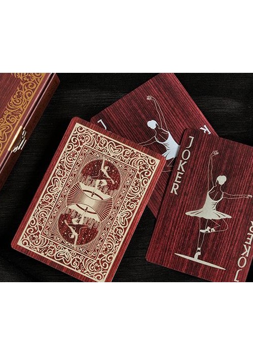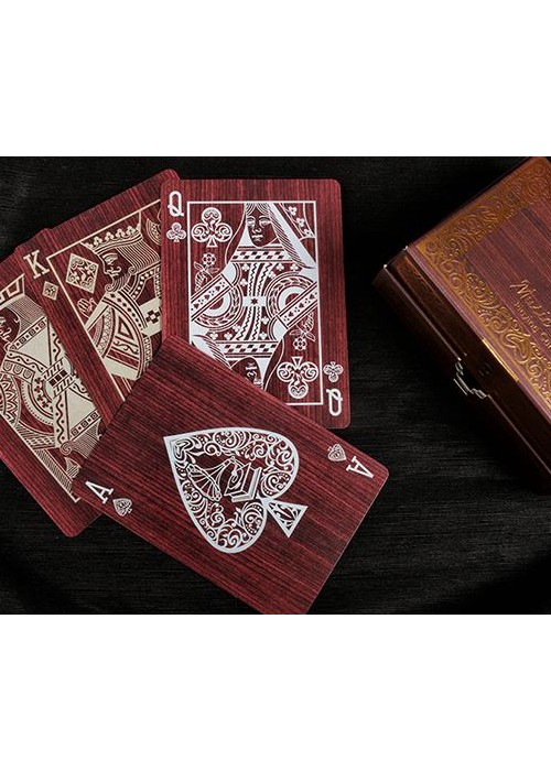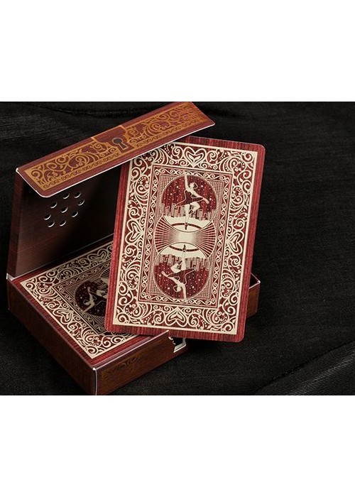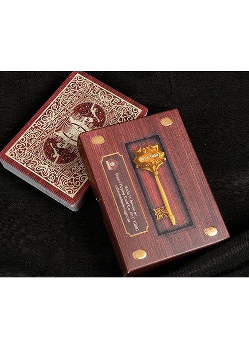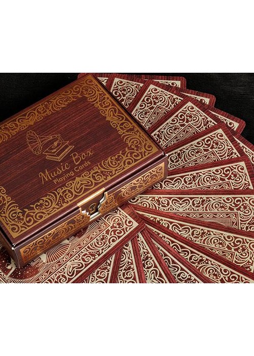 The customized gold foiled Music Box Deck looks and sounds like an actual vintage Music Box! A revolutionary tuck case design opens from the top and once opened, a soft beautiful tune greets you. The song is Claire De Lune and it was recorded using a metal comb flicking against metal teeth giving it the genuine music box sound. Song length is 30 seconds. First Ever Deck To Play Music Gold Foiled, Embossed Tuck Case Magnetic Closing Flap Custom Numbered Gold Key Custom Tuck Case Opens From Top Cherry Wood Look Finish Unique Key Hole Design Printed By Expert Playing Card The deck is complete with a dark cherry wood design finish with raised gold foil. It is a stunner design and one that was crafted to look as authentic as possible. The flap lifts up from the keyhole where the cards lay awaiting to be played with.