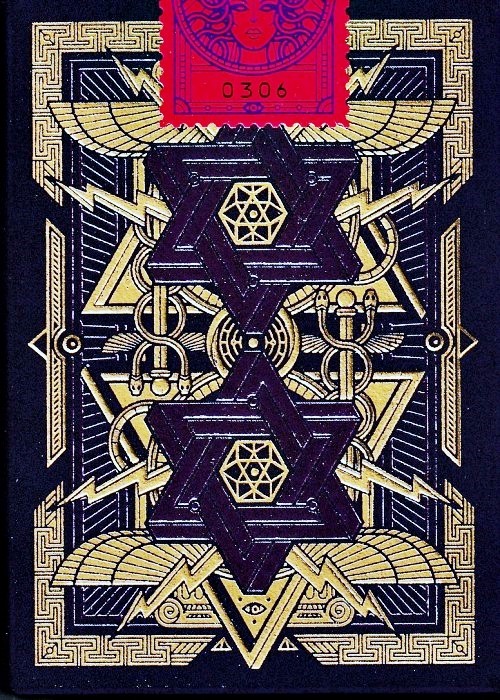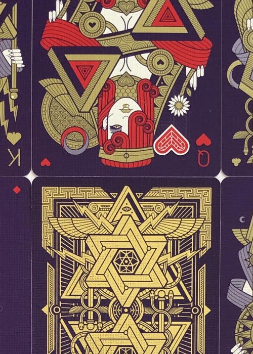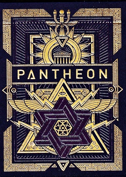 Custom poker size playing cards. Inspired by mythology, drawn with a sharp and modern style, printed by EPCC with foil on backs. Pantheon is a limited deck from TWI (Thirdway Industries), with a luxurious tuck box and gold foil on card backs. I consider it a spin off of Dedalo, and all the court cards are Greek Gods. Tuck box Features: Dark matte paper Embossing Double foil outside, Gold and Violet Red inner foil Numbered custom seal (1-1777) Card Features: 2 Metallic inks on faces, bright gold and bright violet Fully custom: courts, aces, back, box – everything redesigned Gold foil on the backs Limited – 1777 / around 1500 available through Kickstarter NEW – 55 cards (extra joker included)