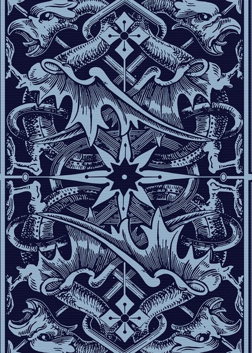 In 2014 I did my first restoration of playing cards. It was the No.18 Triplicate Red and Blue decks. The triplicates are so unique and have always been one of my favorites. My latest project is from the same family and the same year. I am releasing another restoration of the original Triplicates this time I am restoring the Red and Blue Dragon Backs. This was the first dragon back, the United States Playing Card Company still makes a version today. Andrew Dougherty was granted a U.S. Patent for the Triplicate feature which was a miniature card placed in the top left and bottom right corners. It was a revolution in the way cards could be held and viewed. The decorative ace of spades and the wrapper for the first No.18 Triplicate deck showed a fanned hand of cards with the triplicate miniature indices viewable on each card. The United States Playing card company has worked with us on many of our restorations. The tuck box, back design and ace of spades have been approved by the United States playing card company as the restored art work for the deck. A. Dougherty® is a registered trademark of The United Stated Playing Card Company.