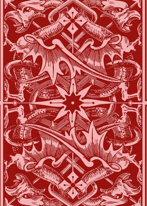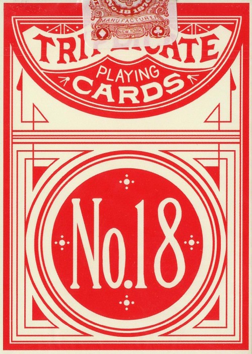 In 2014 I did my first restoration of playing cards. It was the No.18 Triplicate Red and Blue decks. The triplicates are so unique and have always been one of my favorites. My latest project is from the same family and the same year. I am releasing another restoration of the original Triplicates this time I am restoring the Red and Blue Dragon Backs. This was the first dragon back, the United States Playing Card Company still makes a version today. Andrew Dougherty was granted a U.S. Patent for the Triplicate feature which was a miniature card placed in the top left and bottom right corners. It was a revolution in the way cards could be held and viewed. The decorative ace of spades and the wrapper for the first No.18 Triplicate deck showed a fanned hand of cards with the triplicate miniature indices viewable on each card. The United States Playing card company has worked with us on many of our restorations. The tuck box, back design and ace of spades have been approved by the United States playing card company as the restored art work for the deck. A. Dougherty® is a registered trademark of The United Stated Playing Card Company.