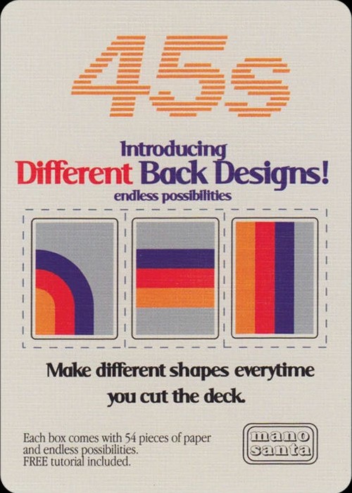 The debut deck from cardistry brand ManoSanta. The unique design features three different backs – the horizontal, the vertical and the curve – covered with a retro look that when utilized with cardistry makes for some seriously interesting displays.
