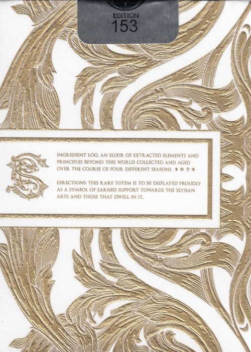 Only available with the Cabinet of Curiosity pledge, the Apothecary White Gilded Elixir deck is similar to the Black Gilded Deck; however the tuck is different and the cards are gilded in holographic foil.
