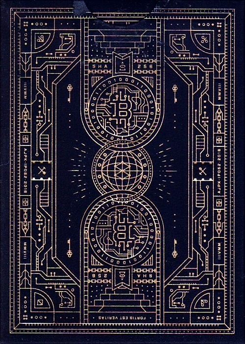 Know the identity of each and every card without looking at the face – you wizard! Every aspect of this deck was designed to mirror the Bitcoin currency – the value, the look, the feel, and ultimately – the story. The box features premium soft touch black dyed paper with interior/exterior black and gold foil. No details are left behind. Satoshi Nakamoto’s White Paper is inscribed to the inside of the card box in the font of the United States’ Declaration of Independence. A peer-to-peer CASH system. (A) FORTIS EST VERITAS Latin for Strong is the Truth. (B) Binary code that translates to 21M, or 21 million coins as the maximum supply. (C) Hammer and Shovel – referring to the miner ecosystem that secures the protocol. (D) Elements of Illuminati – imprisoned by the cryptography and security of the SHA-256 algorithm. (E) MMVIII, a Roman numeral for 2008 refers to the publication date of Satoshi Nakamoto’s White Paper. (F) A block that symbolizes the world secured by the global transparency of blockchain which is anchored by the iconic digital B of the Bitcoin currency protocol. (G) TWO secret codes revealing the identity of the card from the back design are also included with SIMPLE and easy to learn instructions on how to read them. The Secrets: Each deck of cards includes an easy to follow instructional video on how to read and decode the binary and serial markings! We even teach you a fun trick to amaze your friends – learn instantly, with just minutes of practice! Illustrated by Billy French Printed on the new thin Stud Finish by Legends Playing Card Co. The cards are poker size. Full deck scan by macstrat @ https://cardscans.piwigo.com/index?/category/549-bitcoin