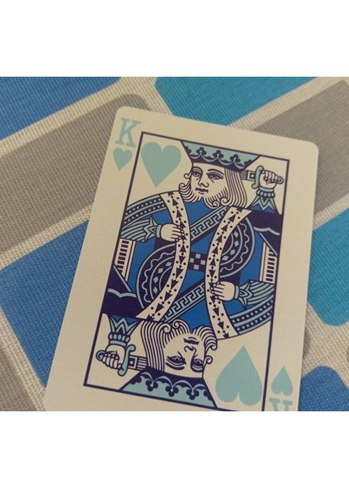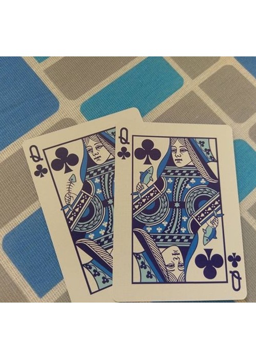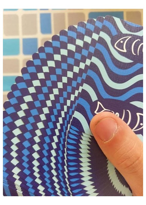 Deck created by Max (Max Playing Cards) for a popular beach restaurant in Malaga (Spain). The tradicional faces have been customized with sea blue tones and queens have fishes in their hands. A deck made for cardistry and magic includes an awesome card back for fans and one gaff card. Limited to 555, this numbered edition is not for sale and has been given to the restaurant customers.