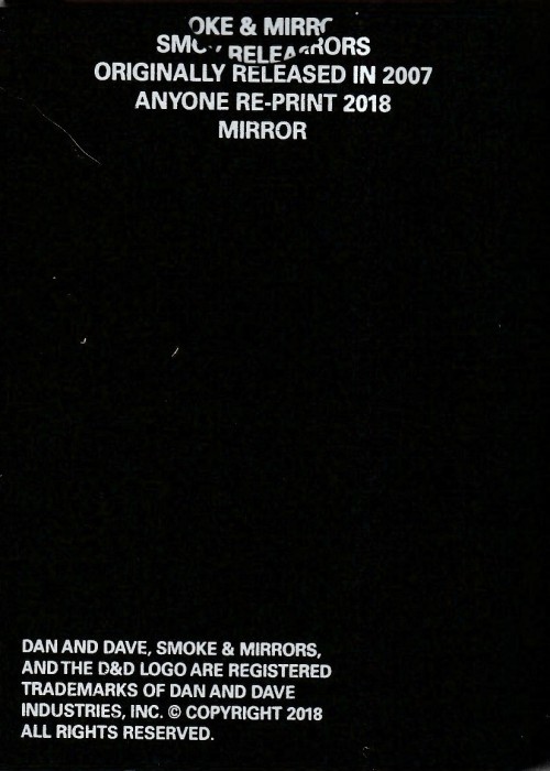 In 2007 Dan and Dave launched their brand of custom playing cards called Smoke & Mirrors. The inaugural release was a two-deck, black and white set. The cards, and the series that followed, became extremely popular in the magic and cardistry community. In 2012, after fifteen editions, Dan and Dave retired the brand. Six years later, Dan and Dave teamed up with Anyone Worldwide for a unique collaboration that introduced Smoke & Mirrors to a new generation of cardists. Anyone x Mirror is a minimal redesign of the first edition Smoke & Mirror, focusing on brand iconography and fashionable aesthetics. It is as unique to Anyone Worldwide as it is a throwback to the beginnings of cardistry and the original hype deck