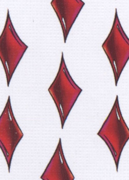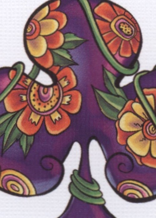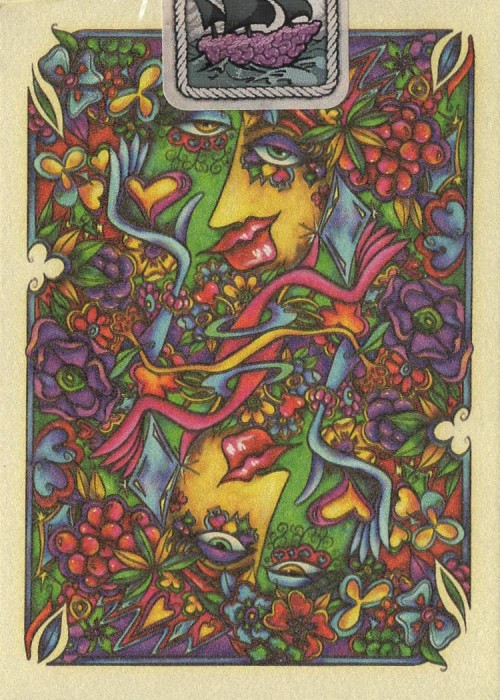 Custom illustrations by Denyse Klette on all of the court cards, back card, and jokers as well as custom pip illustrations for the numbered cards.