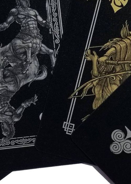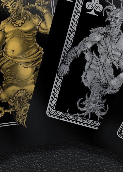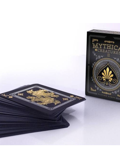 This custom deck of playing cards features Mythical Creatures from Greek, Norse, Egyptian and East Asian traditions. Each suit represents a different pantheon and includes symbols and iconic elements from each. This deck includes 52 cards plus two unique jokers and a card identifying all the Mythical Creatures. This deck was illustrated by Gustavo Borboa. Custom deck of playing cards featuring Mythical Creatures from Japanese, Celtic, Greek and Near Eastern traditions. Deck includes a Hippogriff, Kitsune, Manticore and a Banshee to name a few. Hand drawn artwork and custom pips. 52 cards plus two unique Jokers and a card identifying all the Mythical Creatures. 100% Black PVC Plastic Custom Gold Foiled Tuck Box