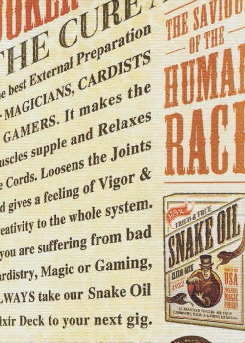 The Tuck Box features Pen & Ink drawings of an old-school Con Man / Snake Oil Salesman and a menacing Snake. The overall Tuck design is reminiscent of old Snake Oil Elixir Ads, including over-the-top quotes such as The Greatest Playing Cards on Earth! and The Saviour of the Human Race.