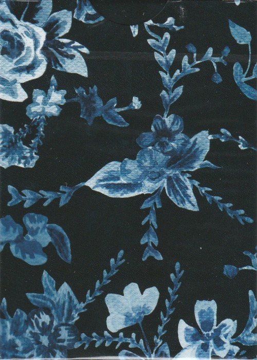 The back of the cards features a beautiful hand-drawn watercolor two-way design with floral themes such as vivid-colored flowers and leaves which are contrasting the navy blue background. The tuck box teases its’ contents with a preview of the cards, with intentionally muted colors to differ from the back design while also preserving all similarities. Full deck scan by macstrat @ https://cardscans.piwigo.com/index?/category/297-subrosa