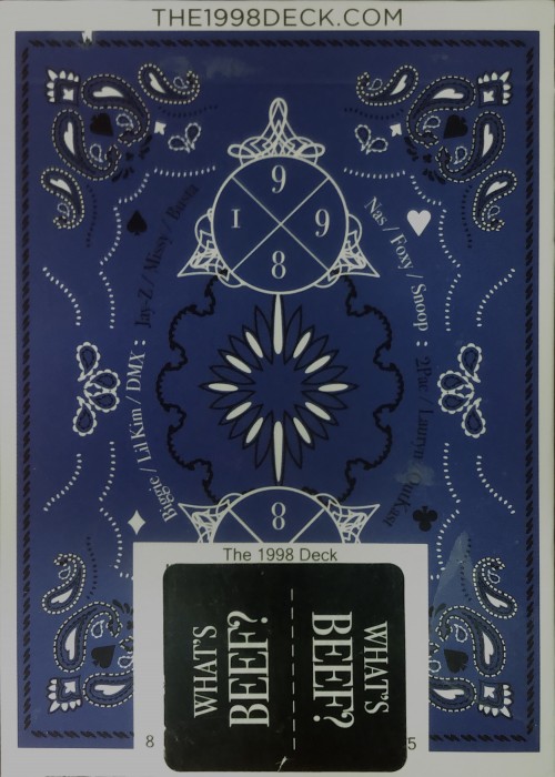 154 backers pledged $5,919 to help bring this project to life, shipped in 2018. Custom suits and artwork aces. The court cards feature hip hop stars which are designed like two-way cards, but the pictures are different one way than the other. The jokers are different and feature additional one-way hiphop stars. There is an additional card with a note from the designer on one side, and an illustration of poker hands on the other. The backs are two way and look like the back of the tuck bos, but where the tuck box has names of hip hop artists, the card backs have handkerchief paisleys. They are a different blue than the box, still dark, but a ‘greener’ blue. In addition, the white Bordereds of the card backs are blank, whereas the tuck box says the company name. The flap tucks into the front of the box. A bonus sticker, visible in the photo of the back, came on the cellophane, and says What’s Beef? I pasted this over the bar code.