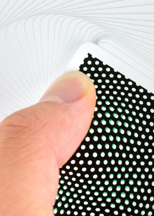 VIEWS Playing Cards are a luxury, illusion-themed deck of cards created for cardists and magicians alike. Manufactured by The United States Playing Card Company. Traditionally-cut and printed on crushed Bee® stock, a dream feel for any card handler. No expense was spared to create this unique deck of cards. The box is crafted out of a synthetic soft-touch paper for a unique luxury feel. It is surrounded by the mind-bending illusion hot-stamped in white and mint foil. “VIEWS PLAYING CARDS” is embossed and hot-stamped with gold and white foil. The cards are designed from scratch and 100% custom. The back design features the motion-like bending VIEWS dots with a mint undertone to create the illusion. The face cards have custom pips, and the courts have Pantone metallic inks. Designed by Yves Krähenbühl This deck is a limited edition of 10,000 decks printed. After they sell out, they will never be printed again. https://www.gotmagic.com/collections/playing-cards/products/views-playing-cards