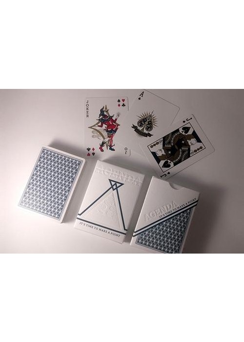 Newly designed tuck case, card back, aces and jokers A clean and classic overall design with white-blue colour scheme Custom pressed tuck case printed with premium white cotton paper, letter-pressed blue ink and Emboss/Deboss Fully customized foiled seal