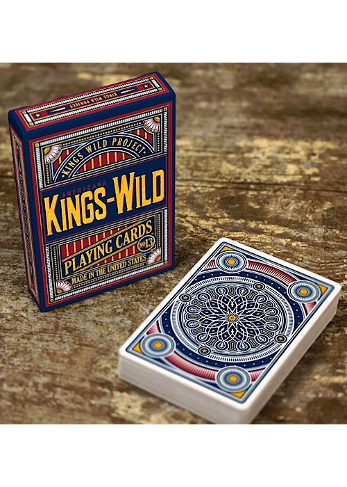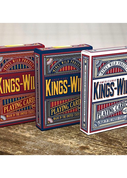 The Kings Wild Americanas sports a red, white, and patriotic blue colorway with custom card back reminiscent of the Tally-Ho circle back, Ace Spades and Jokers. The court cards are Kings Wild Standards and feature the same color scheme as the tuck and card backs. Definitely a beautiful deck for any table game with friends and family.