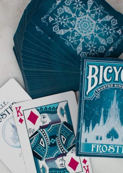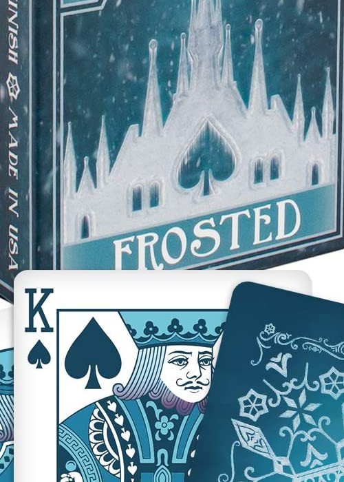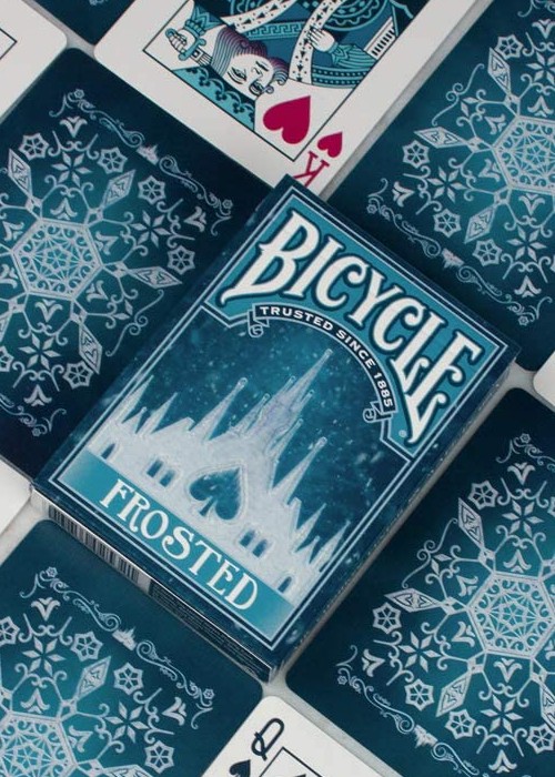 New Walmart exclusive release The Frost deck uses standard court cards dipped in chilly blue aura. There they sit, frozen in time, waiting for the frost to melt. The pips are quite unique as they resemble tiny snowflakes. Each snowflake pip calmly rests upon each card showing off their beautiful form for you to enjoy. Custom seal Air-Cushion Finish Made in the USA Full Deck Scan: https://cardscans.piwigo.com/index?/category/193-bicycle_frosted