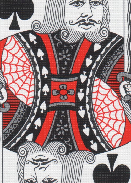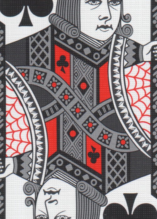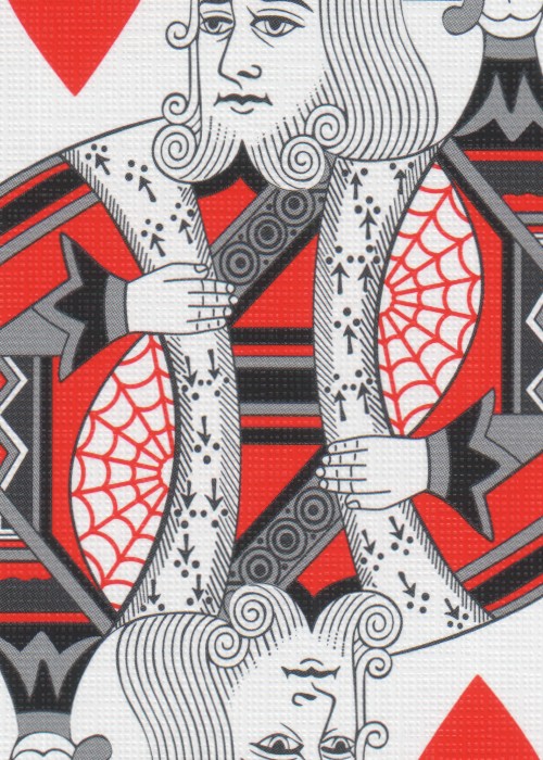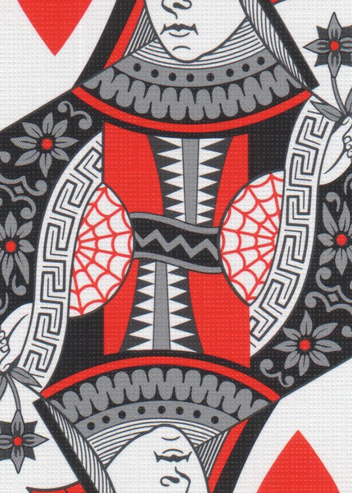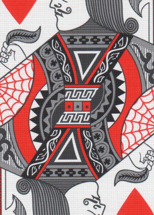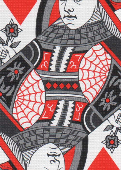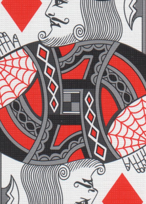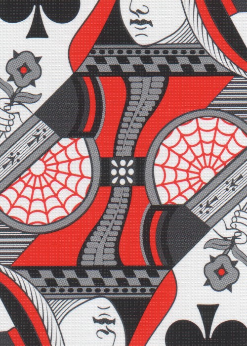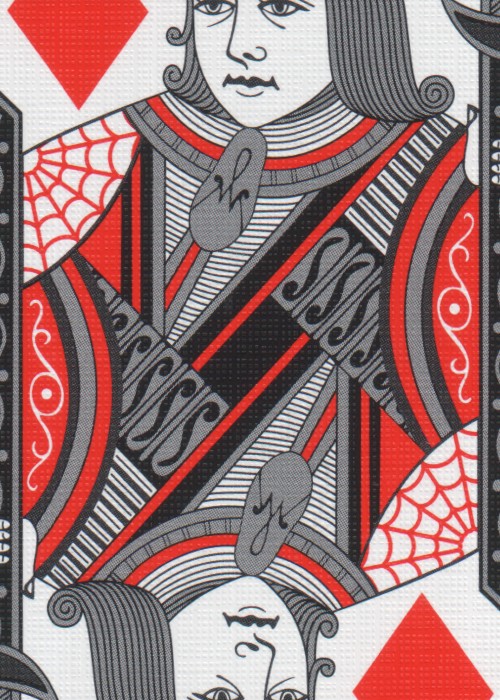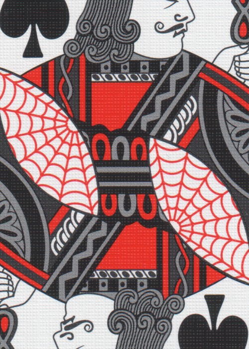 Its venom is reported to be 15 times stronger than a rattlesnake’s. In humans, Black Widow bites can bring on nausea, muscle aches, and make breathing difficult for those who do not respect the ruby-red hourglass warning. Black Widow Playing Cards is perfect for magicians and cardists who want to capture the attention of their prey. Ensnaring their audiences with its metallic red foil web, and the tell-tale hourglass adorning the card backs. Feel the power as you destroy the custom red fly seal. Let the printing design inside the tuck, surround you… wrap you… with its macabre beauty. Designed by Justin Froyd Custom designed court cards, Aces and Jokers Metallic red foil and embossed tuck