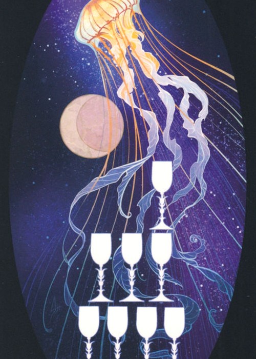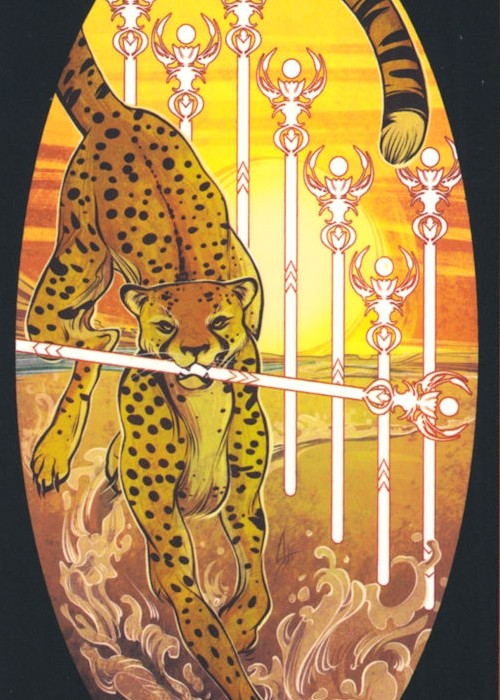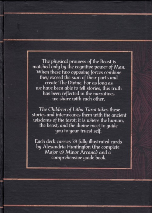 The Major Arcana (or Trump cards) are the foundations of the tarot. These are the gods and goddesses of the deck, and as such they represent cosmic, karmic, universal forces or changes and present profound and overarching life lessons. The figures in these cards are all some kind of animal-human hybrid (with few and purposeful exception). This is because they unite the themes of the human condition and the universal, primal energies of nature. The Aces, or “Root cards” are the root or essence of each suit. The skeletons in each Ace are of an animal from their domain and represent the core or foundations of their power. The bones are, after all, what we leave behind: they are our truest form after life and death have stripped us of all that is superfluous and superficial. They are our foundations, and so too are the Root cards the foundations of each suit. Court cards, or “face cards” refer to The Page, The knight, The Queen, and The King of each suit. If the major Arcana can be thought of as the divine, and the Aces as the elemental spirits just below them, then the court cards represent the people living powerfully in that physical plane the next tier down. This is signified by human figures interacting with their animal companions, highlighting the relationship humans share with their animal counterparts in the mortal plane.