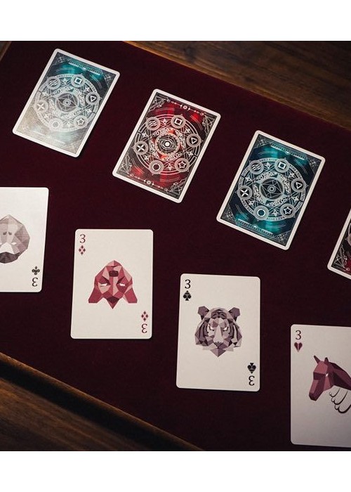 Card Back: The nebula pattern superimposes the white lines, reinforcing the magical attributes of the entire deck. The back of the card includes six symbols and twelve constellations that can be used for prediction. The subtle differences in the back of each card allow the user to read the suits and value of the card.