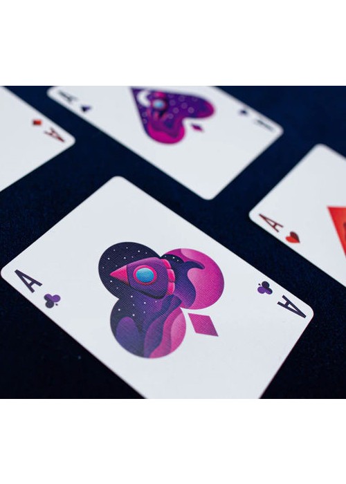 The aces follow a similar design to the court cards, featuring a silhouette of a particular suit with a vista of a space shuttle flying through open space behind it.