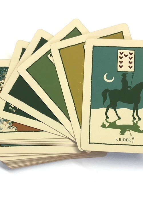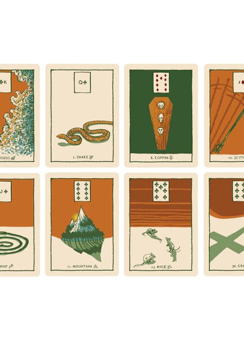 The special feature of the deck is The Green Glyphs Guide – An 80 page full color guide (measuring 4 x 6.5 inches) meant to offer a brief introduction for reading your Lenormand deck. It includes an introduction that answers some of your burning questions about Lenormand and 40 pages of card meanings and example combinations followed by a section that details how to read a Grand Tableau and instructions on how to play The Game of Hope a multiplayer game that uses all 36 cards as a board game!
