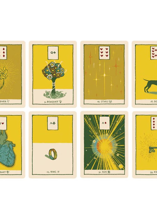 What is a Lenormand Deck? A Lenormand deck is different than a Tarot deck. Both can be used to do readings; Tarot helps to reveal your unconscious path and focuses on the mind, while Lenormand can tell a story, describe events and offer insight into people, places and timing. Lenormand is an oracle deck comprised of a set of 36 symbols that remains the same throughout all decks. Each card has carries it’s own importance in telling a story. You can read cards in pairs or triplets or in groups, but the real magic of Lenormand lies in reading all 36 cards together in what is called a Grand Tableau. It can be an exquisite tool for storytelling and will keep your creative wit fresh. This deck can be used beyond readings: it can be used to play the Game of Hope, to spark poetry or to play Green Glyphs Bingo.