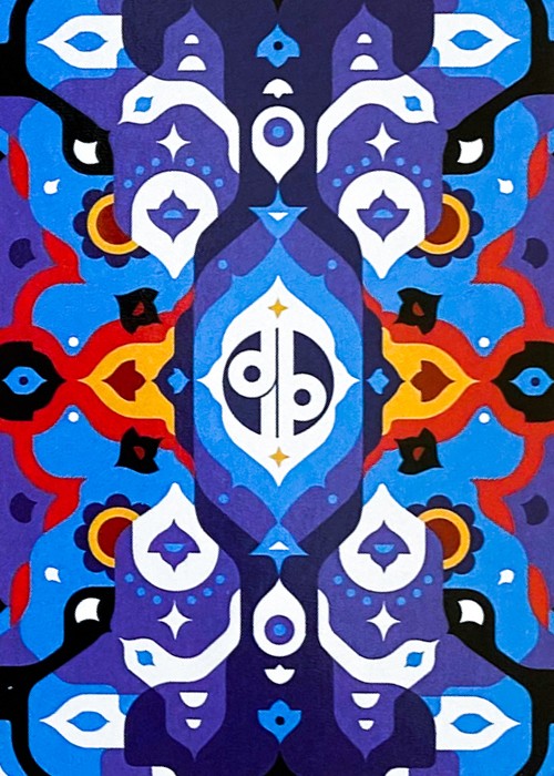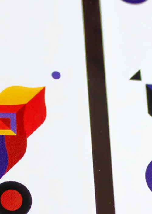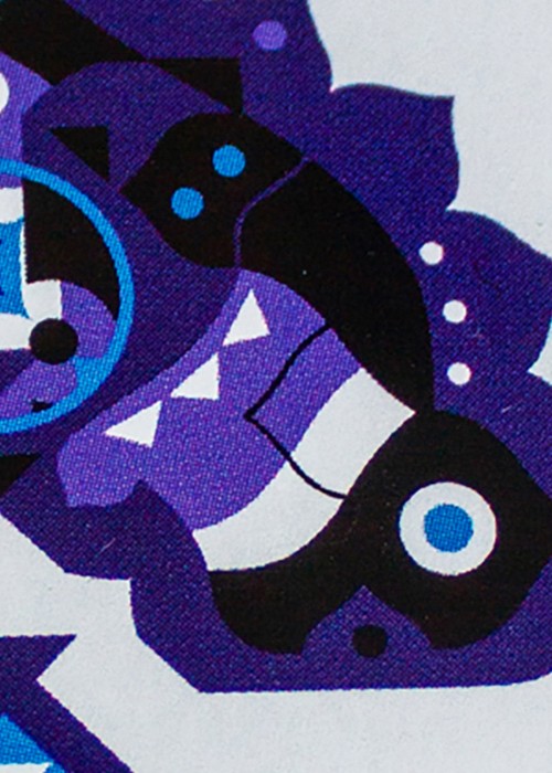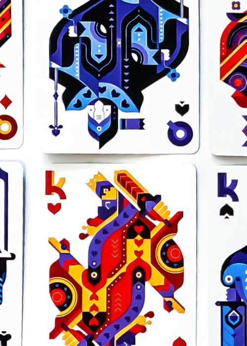 Double-ended courts colored blue, purple and black on the black suits and predominantly red, yellow, purple and black on the red suits. The same two color schemes are used for the Jokers. The font used is striking and original. Several, slightly different versions of this pack have been produced, including one with black backgrounds and Borderless (Full Bleed) backs. The cards shown here are from the first printing, a limited edition – see Ace of Spades and back of box.