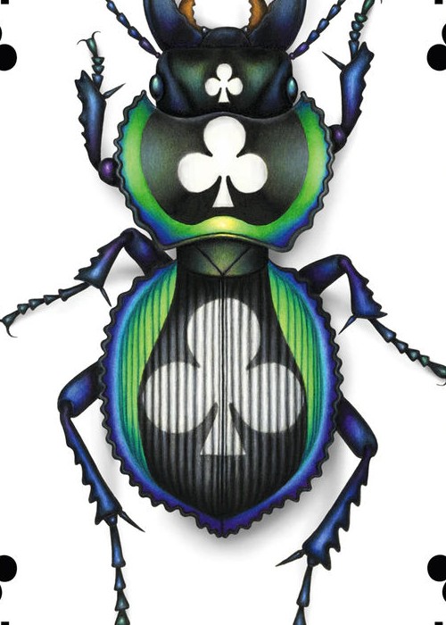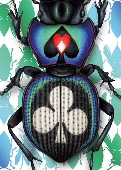 I’m always curious about how nature responds to change, & how life adapts to new environments. In my Cryptic Cards deck, I imagined what would happen if moths evolved new wing patterns to hide on human-made materials like playing cards. The idea behind Insecta, rather than cryptic camouflage, is a colourful symbiosis. I’m asking ‘what would happen if insects evolved a symbiotic (mutually beneficial) relationship with card players or collectors, and adapted to new habitats in our spaces?’