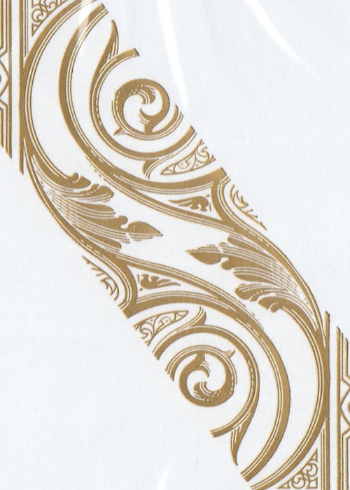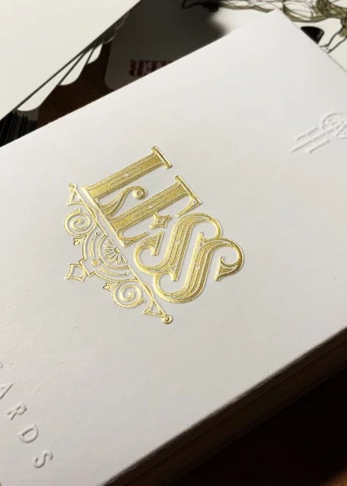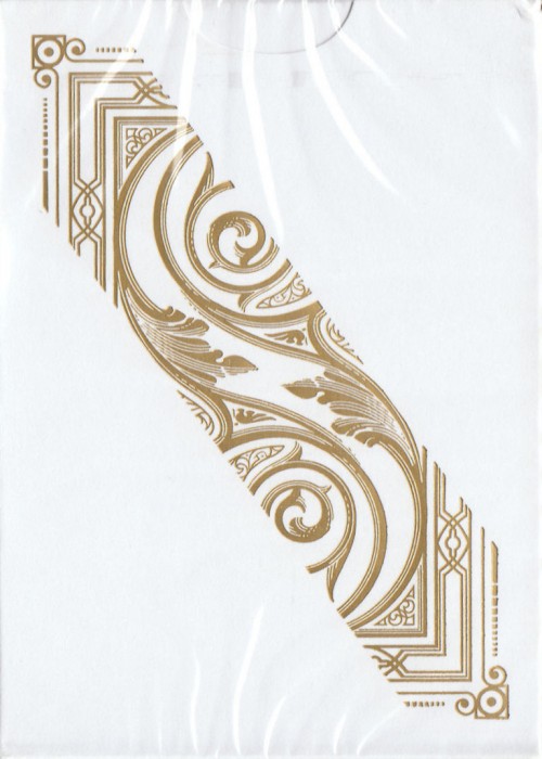 The tuck case is printed on a soft, uncoated white stock and is all embossed with just a few foil accents.