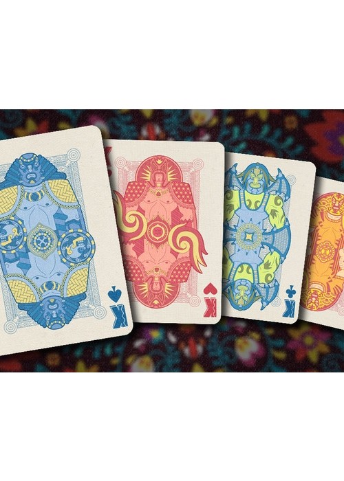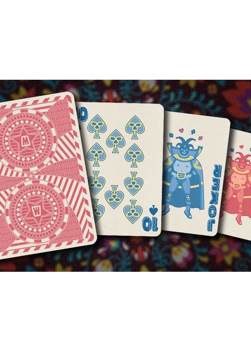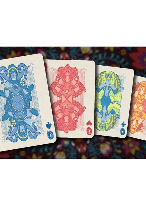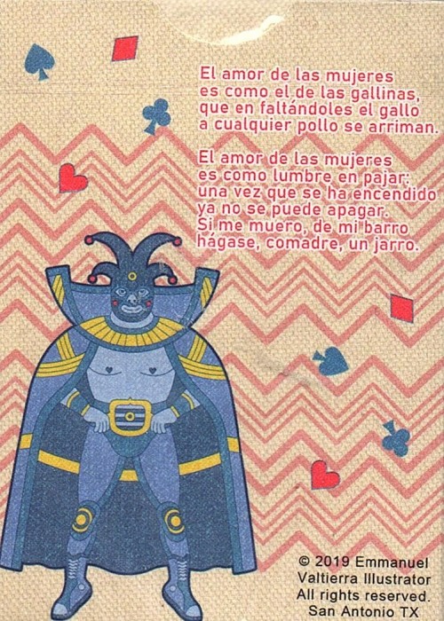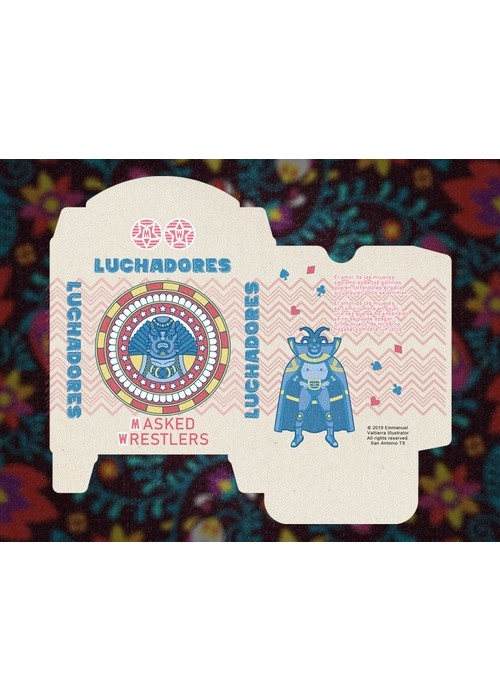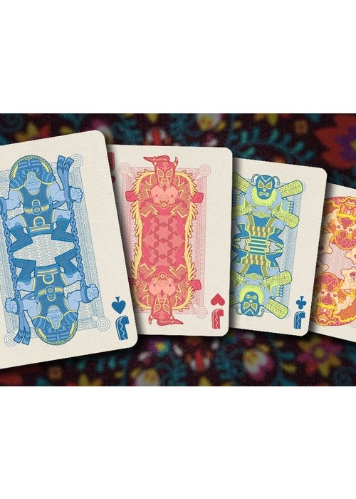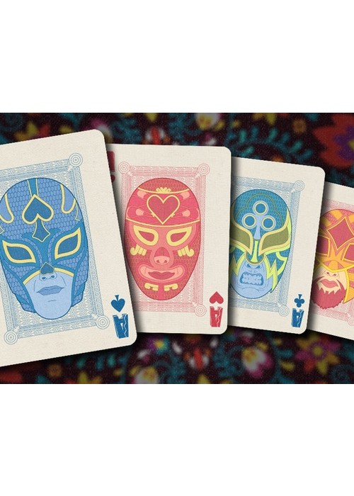 Printed on NPCC. 52 Playing cards 2 Jokers Custom back card design Hand drawn illustrations Original tuck box On linen Full Deck Scan: https://cardscans.piwigo.com/index?/category/31-luchadores