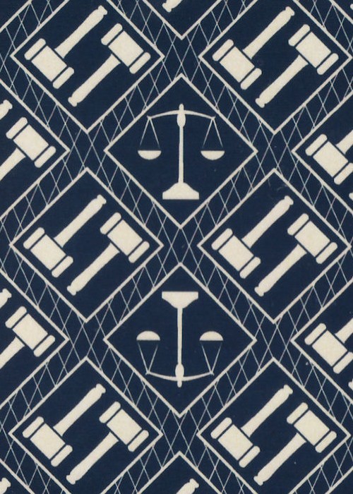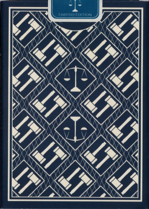 The project theme is the law. The tuck box features original artwork and logos with legal themes, including the scales of justice, gavel, and popular legal phrasing in Latin.