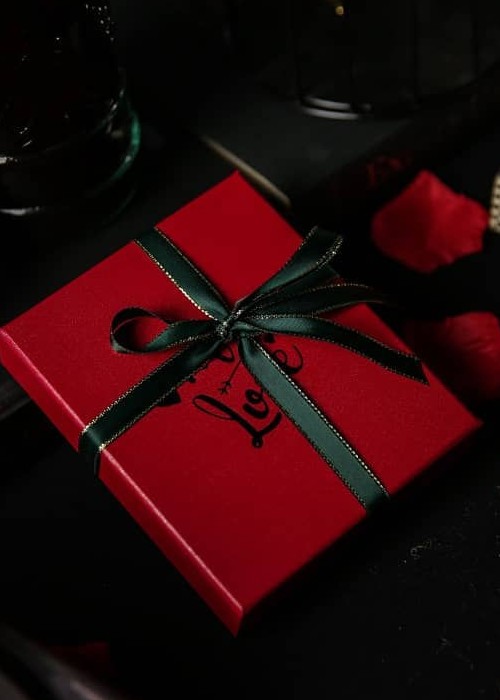 There is a combination of the word My love in black color that matches the card face, heart and Cupid’s arrow on the front of the gift box .