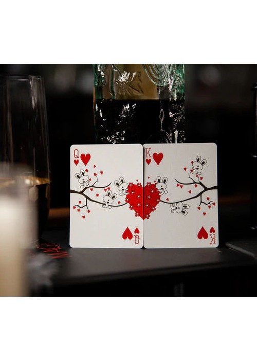 The faces are redesigned , if you look carefully enough you will find that there is a whole new picture if you piece Q and K together , so there are totally four pictures for you to discover. Besides , you can see many lovely rabbits and other elements about love like staff , Eiffel Tower , heart shaped balloon etc.
