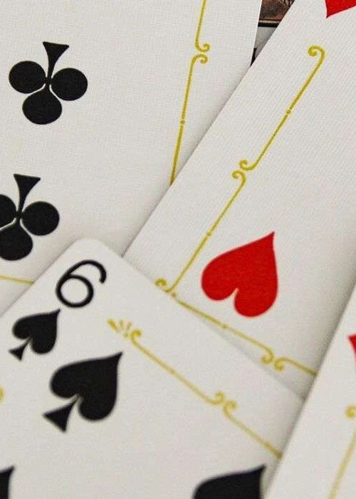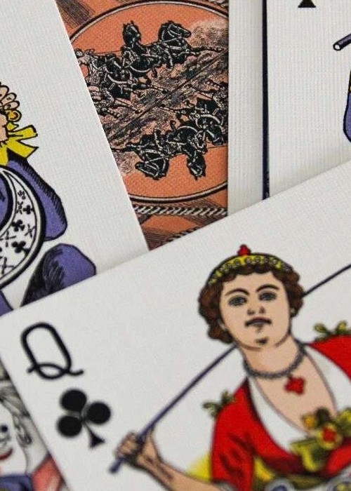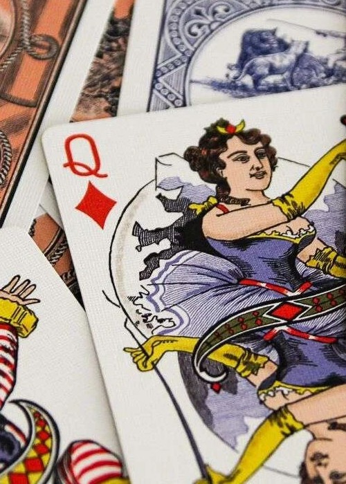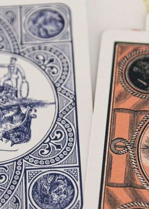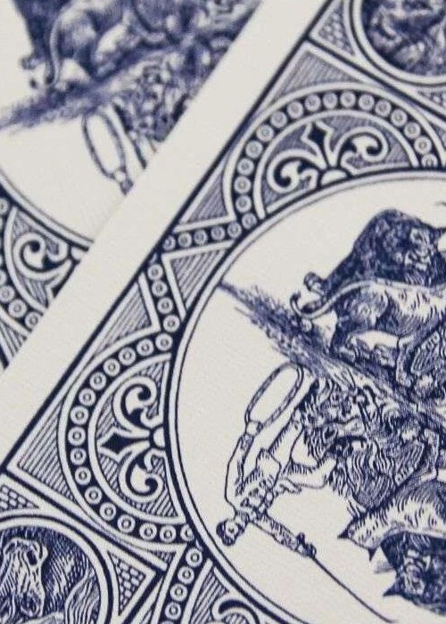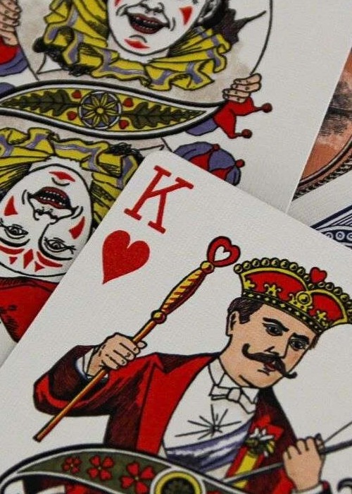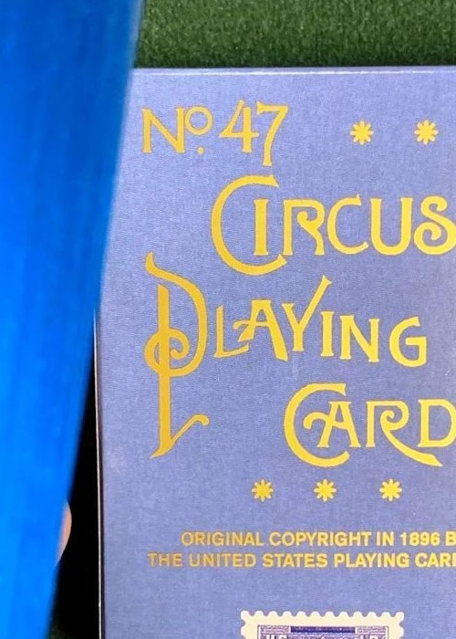 Gilded version of: First printed in 1896. The original No. 47 Circus Playing Cards advertising copy said: “The staid old Kings, Queens and Jacks have given way to various well-known ring masters, clowns and queens.” This fun all purpose deck features easy to read large indices and 12 interesting individual courts. The original deck only included 1 joker but we added an extra for modern game play. The blue color deck has a 2-way back design featuring a lion tamer and a lion and a horse in the corners.