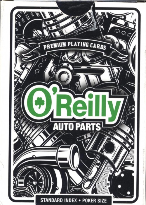 O’Reilly Auto Parts stores began selling their own branded playing cards in late 2019. There are two card back designs, “Pinstripe” and “Parts.” Two unique features of the cards: a black shamrock shape is substituted for all black club pips, and the O’Reilly van character, an anthropomorphic vehicle walking on tennis shoes and wearing an O’Reilly hat, is featured on the joker.