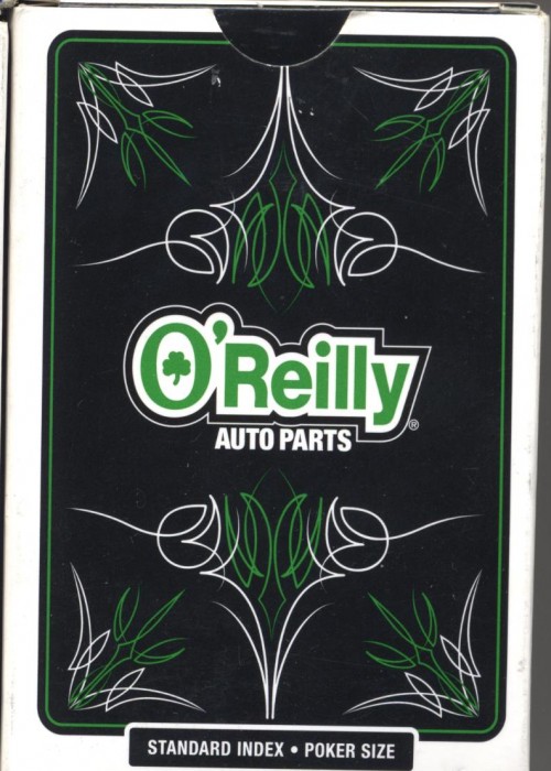 O’Reilly Auto Parts stores began selling their own branded playing cards in late 2019. There are two card back designs, “Pinstripe” and “Parts.” Two unique features of the cards: a black shamrock shape is substituted for all black club pips, and the O’Reilly van character, an anthropomorphic vehicle walking on tennis shoes and wearing an O’Reilly hat, is featured on the joker.