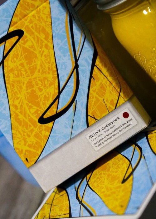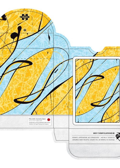 The POLLOCK: Cardistry Tuck Box is printed on a premium Matte Tuck material and features a clear UV Spot Ink overlay that adds a level of gloss in strategic locations. The designs for the Tuck are meant to mimic the look of a Painting displayed in an Art Gallery. The descriptor card and red dot adds to the Gallery vibe. For many Art Galleries around the world, a red dot indicates that a Painting has been SOLD!