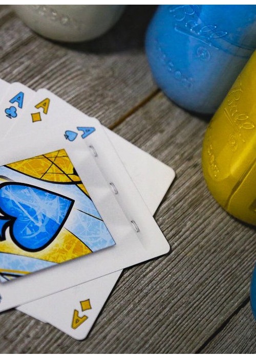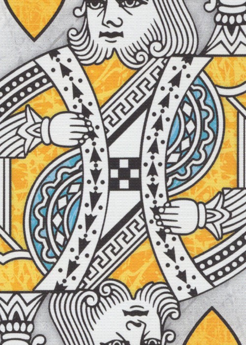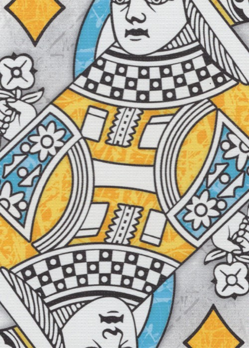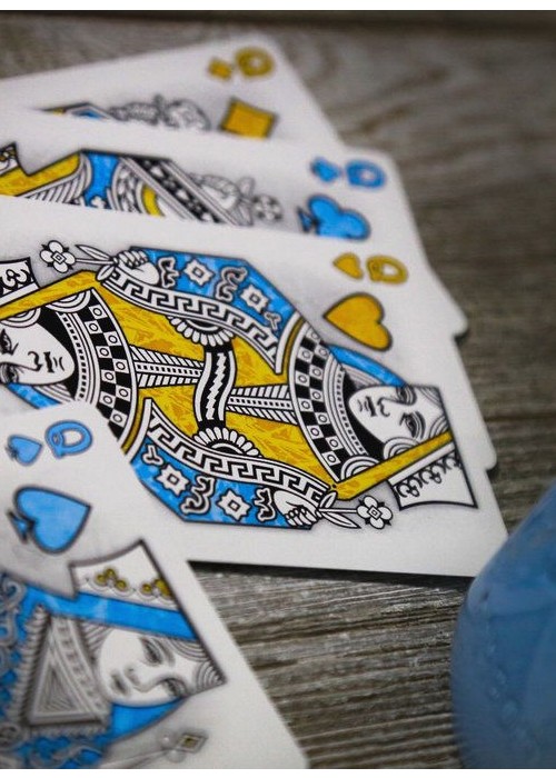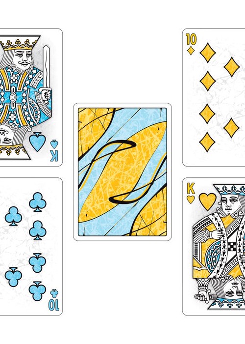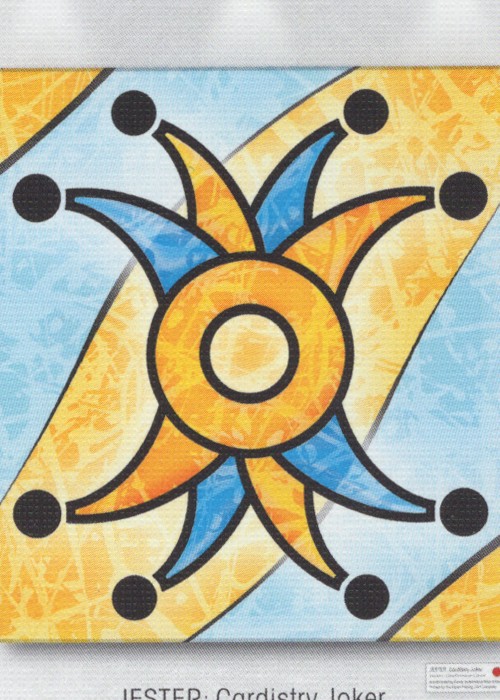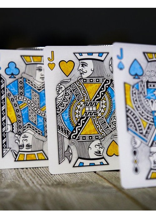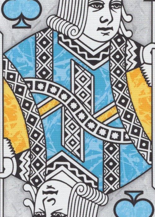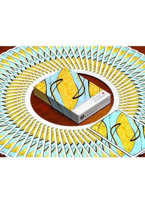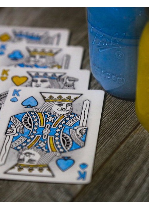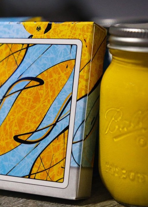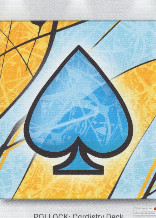 The Back Card for the POLLOCK: Cardistry Deck is an intricate composite of our splatter artwork, made to look simplified with the large color areas. The yellow and light blue colors are accented by rich black design elements. The Ace of Spade and Jokers, like the Tuck Box, mimic a Painting in a Gallery setting. The semi-custom Face Cards incorporate various color combos of the splatter painting composite and create a cohesive look for the rest of the Deck.
