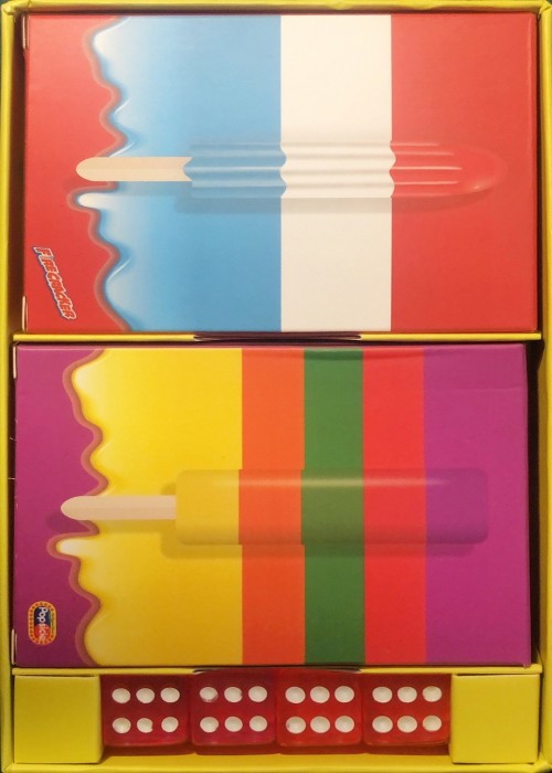 A two-deck set in a two-piece box with two purple and two pink translucent dice. The cards are plastic. The suits are represented by four different types of popsicles, and the pips and court cards are all popsicles. The court cards are all on a yellow background with a Bordered. All other cards are on a white background. The jokers are different, with one showing a jester’s head and the other the Popsicle logo. The backs of the cards are as pictured in the inside of the box.