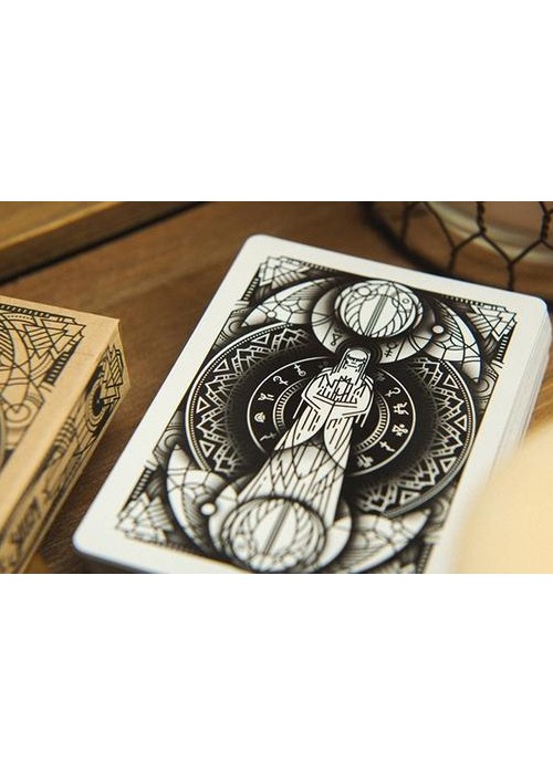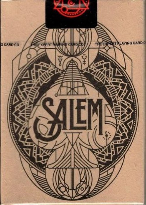 Join the hysteria and the supernatural. Salem Playing Cards remind us of the power of the masses, and the dark history of Salem Witch Trials. With rumors of witchcraft some people were known to have strange fits, or what some people referred to as the disease of astonishment. Let the Salem Playing Cards overtake you. Concentric circles create a stained-glass effect on the tuck and the backs. Geometric patterns engulf a mysteriously shrouded figure. Strange symbols and triangles radiate in its aura. The stark white background is sullied by the black ashes from so-called witches burned at the stake. Triangles point outward in each corner as a catalyst to radiate the evil energy outward. The custom tuck seal is emblazed with a red triangle representing the physical, mental and spiritual aspects of humanity placed over a circle of oneness. One last symbol of hope before it is destroyed as the cards are revealed.