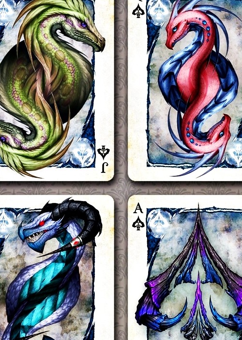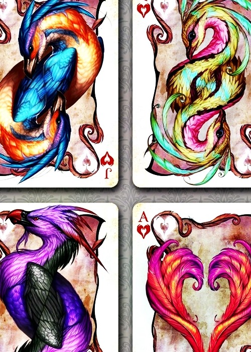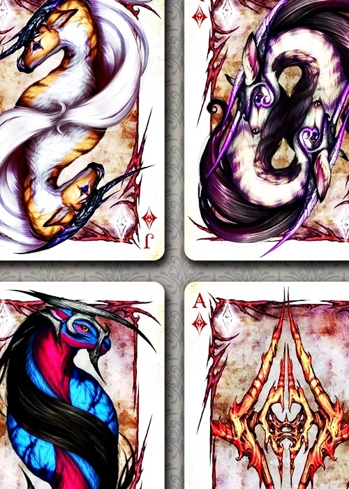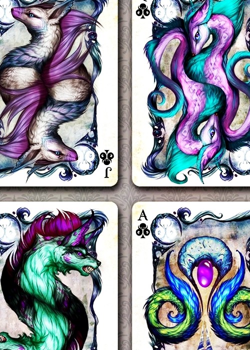 Savage Majesty is an intricately and lovingly painted playing card deck by the artist Leslie Casilli. Inspired by creatures of high fantasy, it features four fantastical races; the Dragons, Zeffurs, Pheonix, and Jazzercorn, each of which represent one of the four suits. The intention of the project was to create a deck which featured colorful and intensely detailed designs that focused on unique creature creation yet stayed true to traditional playing card composition. A defined inner Bordered allows the cards to be able to be read quickly and accurately. The inverted heads stay true to traditional card design. Custom pips make the deck feel unique and exciting, yet are easily recognizable. https://www.kickstarter.com/projects/426623920/savage-majesty-the-playing-card-deck