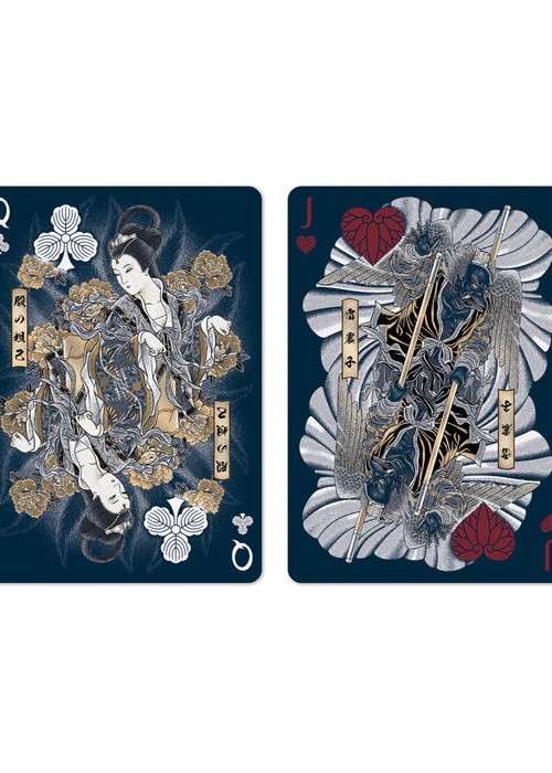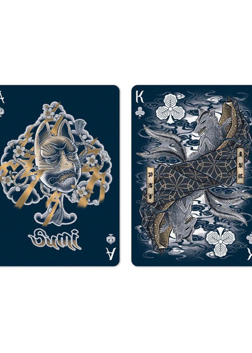 In Kitsune, we continue to translate and transform the traditional Japanese tattoo art form of Wabori into playing card style, retaining as well as enhancing many of the interesting and delightful features we had in Sumi Playing Cards. The focus of Kitsune centers around the fox spirit, a staple in Japanese folklore. We scoured many different sources of folktales, stories and myths about fox spirits and selected a few well-known ones as sources of inspiration for the characters in the court cards. Kistune continues to serve as a homage to Wabori and faithfully represents the visual nuances and quality that is the hallmark of Japanese traditional tattoo once again, creating a visual playing card masterpiece like no other, a masterpiece that weaves fantastical stories of begone time with modern playing card aesthetics.