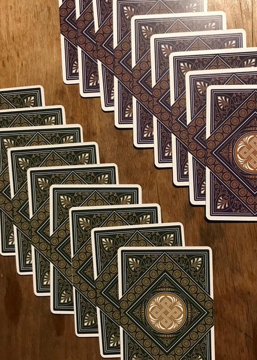 Theos is a completely customized deck of cards. Designed by Parama Playing Cards and manufactured by The United States Playing Card Company on Bee stock. This LIMITED EDITION has a new box design. The deck is made in Italy by Parama Playing cards on Fedrigoni card stock.