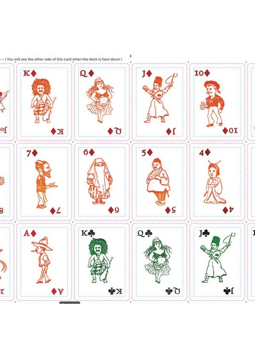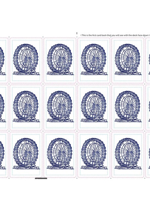 Each playing card went through the press three times, for the character in one of the four suit colors, the card identification, and the Ferris Wheel on the back of each card. The paper is 100% cotton and the letterpress printing leaves a bite in the paper. It took me about 14,000 pulls on the printing press handle and three months to print the one hundred decks.
