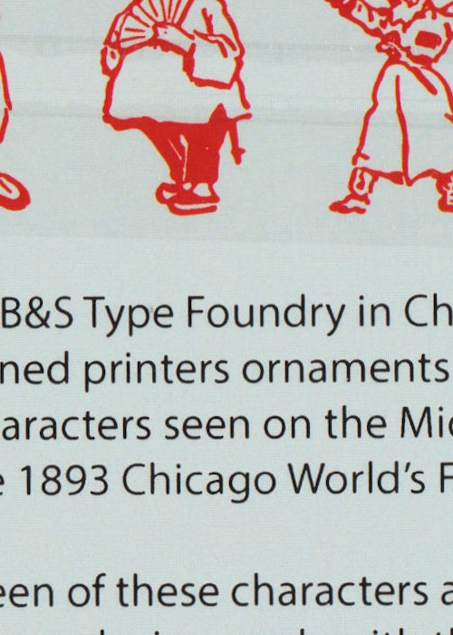 In 1893, Chicago hosted the World’s Fair / Columbian Exposition and the Fair included the very first Midway with the very first Ferris Wheel. Artists from the BB&S type foundry drew images of some of the characters seen on the Midway and had these images made into lead ornaments for printers to use which were about one inch high. The foundry gave these ornaments the name Midway Midgets because of the small size of the print. [It was a different time and was in no way referring to the size of the people portrayed.] I scanned these public domain images and had copper dies made of them expanding the image to two inches high.