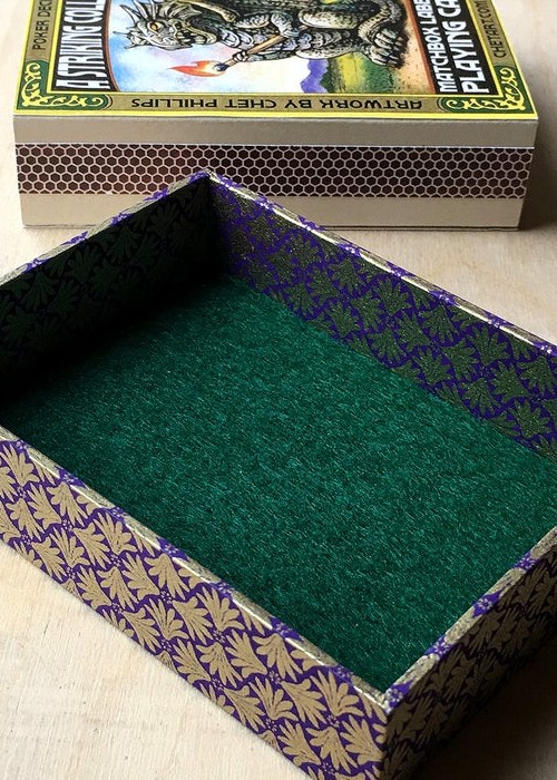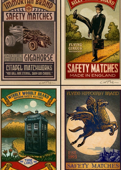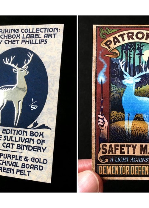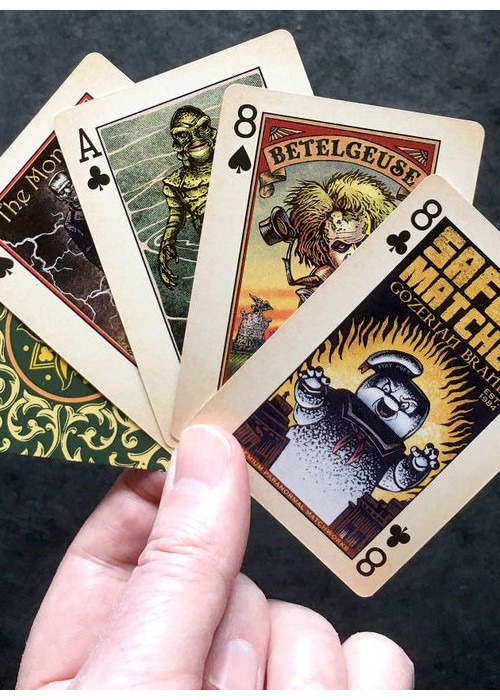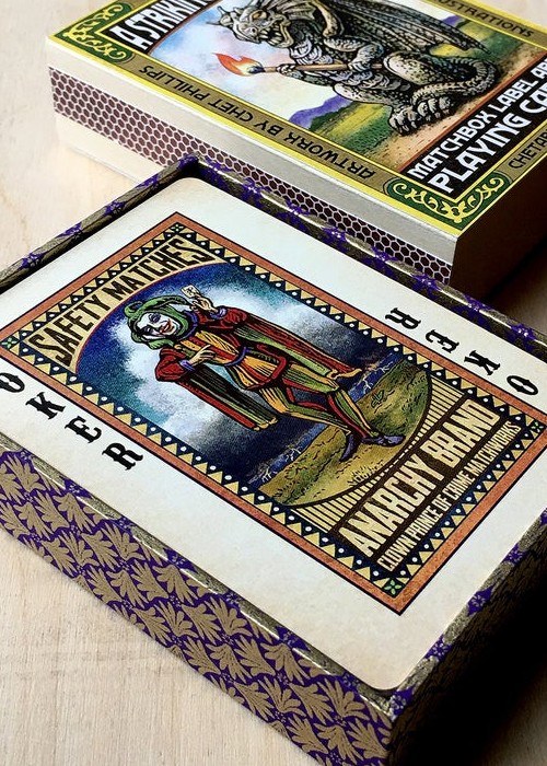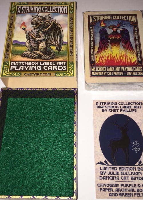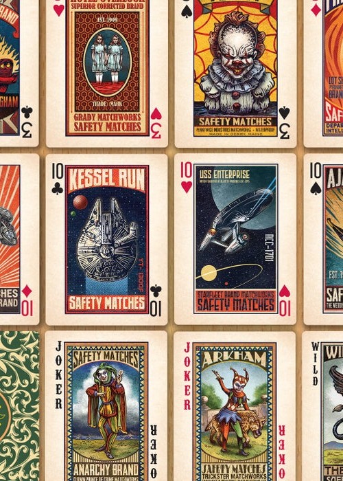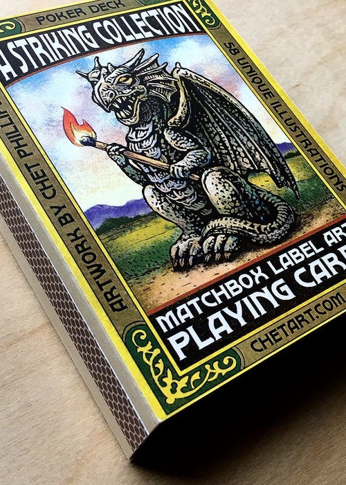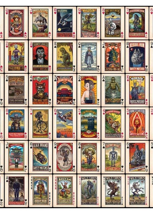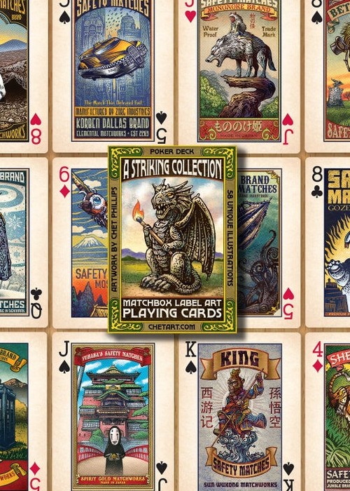 A Striking Collection: Matchbox Label Art Playing Cards. Deck includes 58 individual matchbox label playing cards illustrated by Chet Phillips. High quality, plastic coated standard poker sized deck of cards. Custom back design, 2 Jokers and 4 Wild Cards. Suits represent a variety of characters and objects from pop culture, books, TV and movies emulating vintage matchbox label ephemera. Each deck is sealed in cellophane wrapping and presented in a colorful heavy card stock custom box. Full Deck Scan: https://cardscans.piwigo.com/index?/category/174-a_striking_collection.